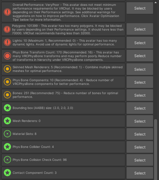 - Skinned Mesh Renderers: 5 | PhysBone Components: 10 | PhysBone Transforms: 170 | Bones: 251 | PhysBone Collider Count: 4 | Particle systems: 0